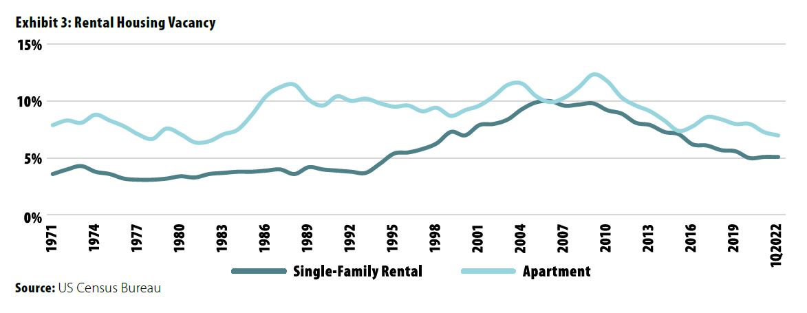All signs point to strong operating and financial performance by SFRs, both absolutely and relative to apartments. SFR vacancy rates have been below apartment rates for decades, as shown in Exhibit 3. Operators point to an overall shortage of SFRs as well as much less turnover as drivers of lower vacancy rates. SFRs also have exhibited strong and stable rent growth, with a long-term average consistent with multifamily rent growth. SFRs have been much more resilient than apartments to economic shocks, with rents growing consistently throughout the dot-com crash, the global financial crisis, and the COVID-19 pandemic, in contrast to apartment rents, which contracted in response to each crisis.